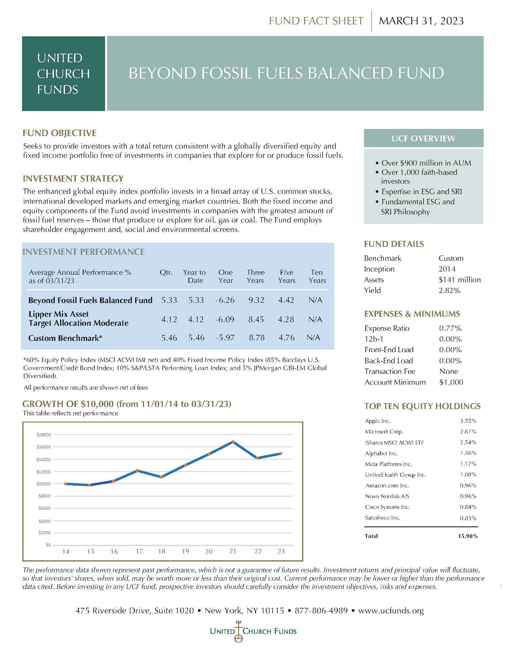 Pursuing a middle-of-the-road approach that emphasizes stocks for higher capital appreciation potential, the Beyond Fossil Fuels Balanced Fund maintains a significant fixed income component to temper market volatility, substituting the Beyond Fossil Fuels Fund for the equity allocation of UCF’s Moderate Balanced Fund. Target allocation: 50-70% Global Equity, 30-50% Fixed Income, 0-10% Cash.