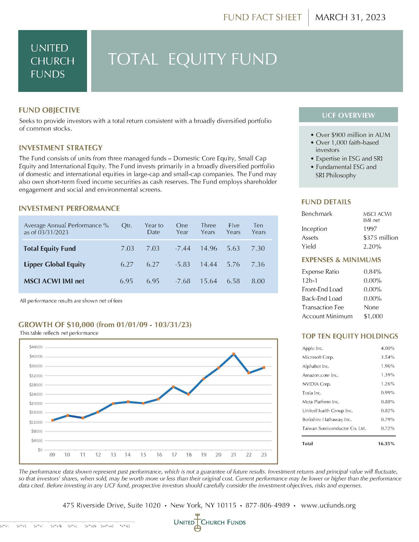 Comprising units of the Domestic Core Equity, Small Cap Equity and International Equity Funds, the Total Equity Fund invests primarily in a broadly diversified portfolio of domestic and international common stocks of both small and large capitalization, and carries a higher degree of risk than UCF’s balanced funds.