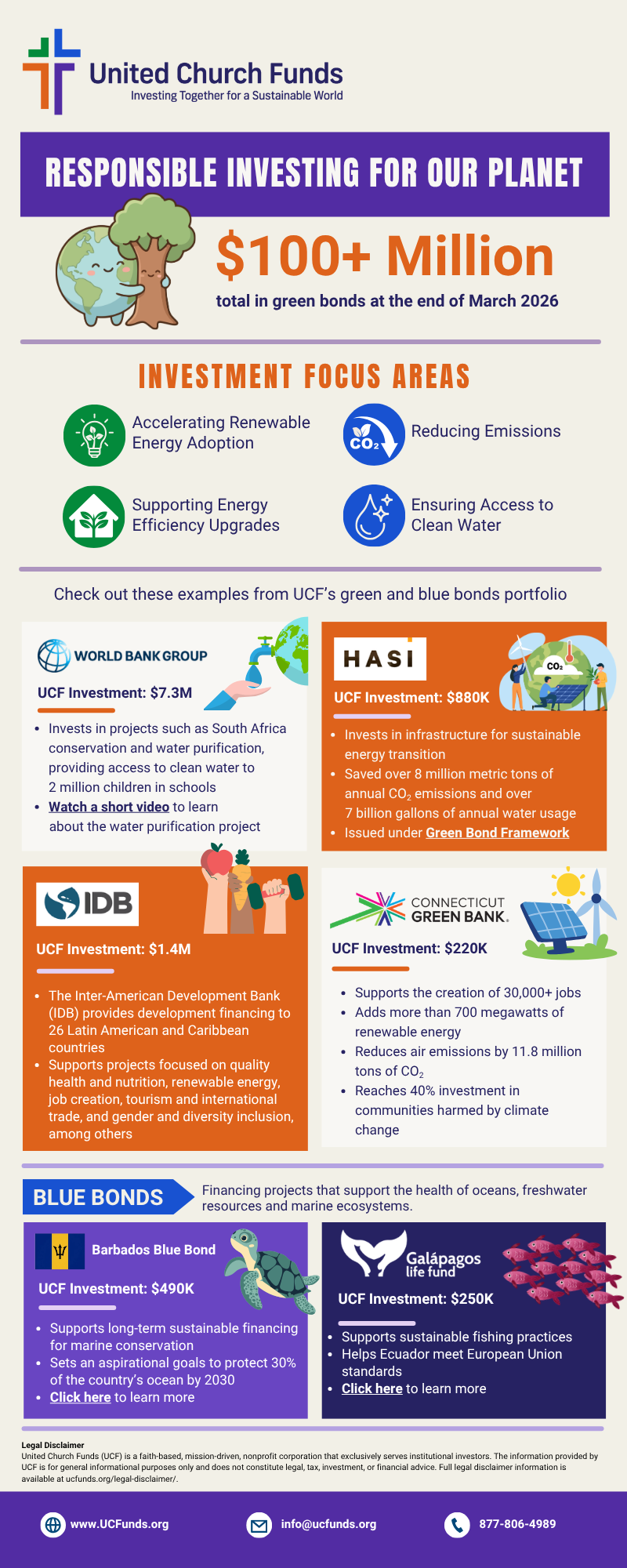 At United Church Funds (UCF), this concept is reflected in our responsible investing strategies, which focus not only on advancing social and racial justice but also on climate issues. For example, UCF’s fixed income strategy seeks stability while supporting measurable social and environmental outcomes. You can learn more in the “Responsible Investing for Our Planet” infographic below.