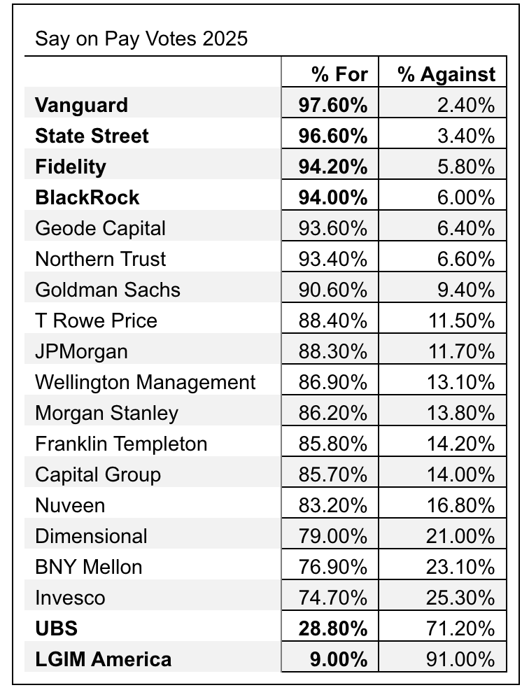 The voting results of American asset managers studied contrast sharply with two European managers, Legal & General (LGIM) and UBS. LGIM America, the U.S. arm of London-based LGIM, reported $1.53 trillion in assets under management (AUM) and only voted in favor of executive compensation packages 9% of the time. UBS — based in Geneva, Switzerland, and reporting $6.6 trillion of AUM —only supported these packages 29% of the time.